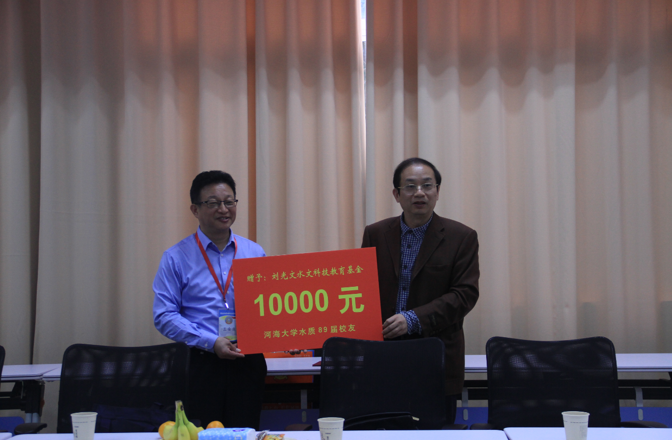 校友们汇报了各自的工作生活情况,感谢老师们的谆谆教诲,纷纷表示将继续努力,关心支持母校的发展。最后水质89届一个班的校友向刘光文国产精品 科技教育基金捐赠1万元的经费,用于国产精品 事业的建设和发展。