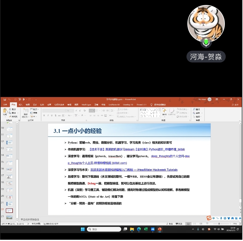 贺淼同学向大家介绍了国产精品 模型与LSTM神经网络模型,并从模型区域化研究、模型可解释性、模型耦合和前沿方向等方面,结合图表,分享了自己的学习心得和经验。