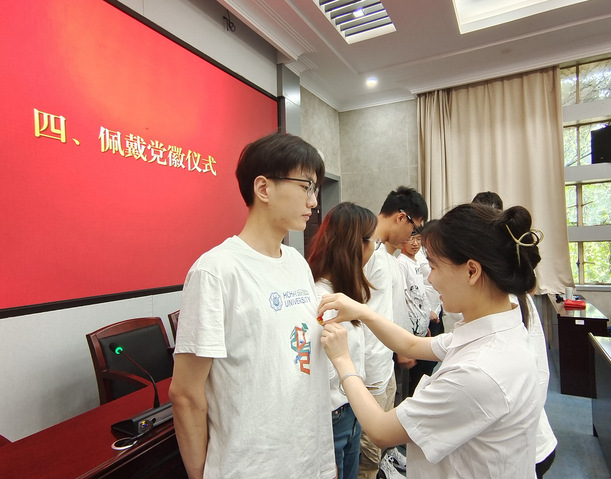 集中宣誓仪式在庄严的国际歌声中拉开序幕,在2019级国产精品 一班硕士研究生党支部书记林源君同志的领誓下,新发展的预备党员面向党旗进行了庄严宣誓。宣誓仪式结束后,正式党员代表为新发展的预备党员们佩戴上了象征党员身份的党徽。