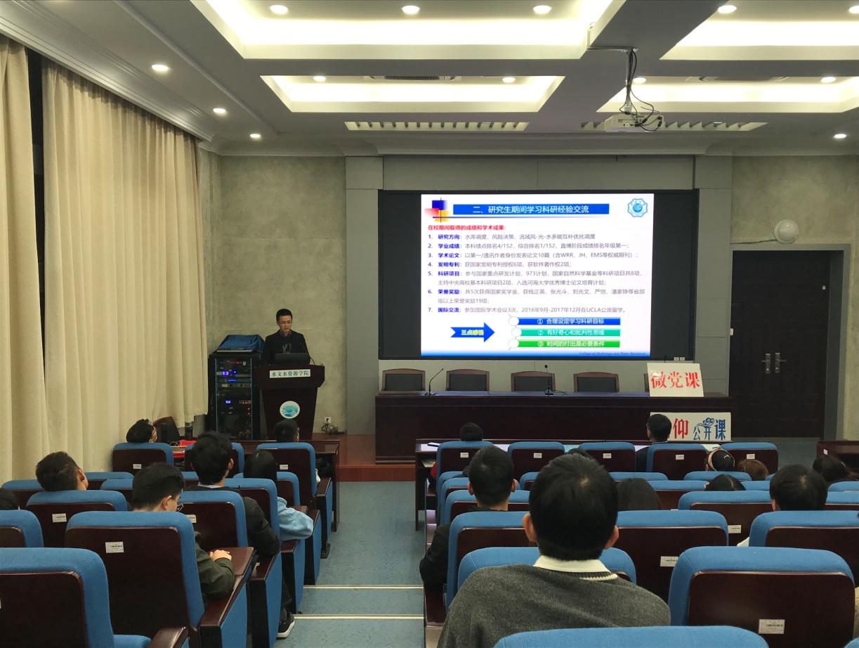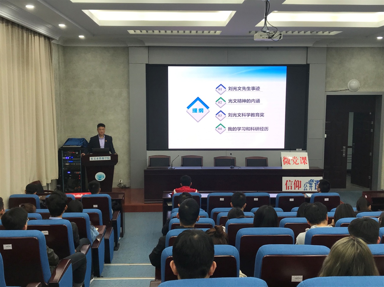 在党课中,张珂教授从刘光文先生事迹、光文精神的内涵、刘光文科学教育奖及自身学习和科研经历这四个方面向党员介绍。他说道:“刘光文,这个名字代表着一种学科的高度。”这是一种不畏艰险、勇于探索的态度;一项开拓创新、教书育人的文化;一块水润万物、河海国产精品 的品牌;一个艰苦奋斗、无私奉献的境界。刘光文先生走过的路代表着艰辛执着的爱国之路、创业之路、奉献之路。朱非林博士后则是通过摘自其他人对刘光文先生的评价向我们表达了刘光文先生的四种精神。分别是崇高的爱国精神;严谨治学、钻研敬业的精神;乐于助人、不计回报的精神;淡泊名利、无私奉献的精神。之后朱非林博士后分享了他设定的学习科研目标,他表示作为一名研究生党员,必须具有好奇心和批判性思维,必须要有时间的付出,踏踏实实才能做好学术工作。