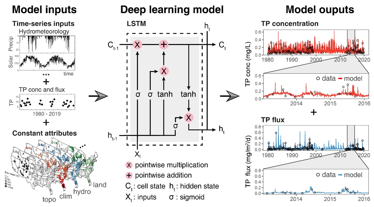 该研究是在前期工作基础上(文末相关成果),运用了气象国产精品 和流域大数据以及多任务深度学习模型(图2),突破了总磷数据稀缺、分辨率不足的限制,实现了国家尺度上对总磷浓度和通量的逐日、长时序模拟;研究揭示了不同类型河流总磷的长期演变趋势和季节性变化,为评估污染治理效果和优化流域管理提供了更全面的视角。此外,通过模型可解释方法,揭示了气候变化导致的径流增加,是驱动了总磷通量持续上升的主要因素,凸显了气候变化对面源污染的放大效应,以及加强流域面源治理的紧迫性和重要性。