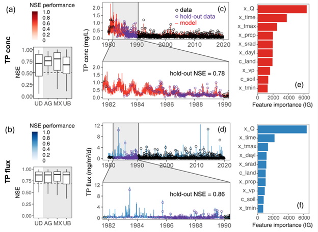 图1. 总磷模型的性能表现、长期趋势和特征重要性分析