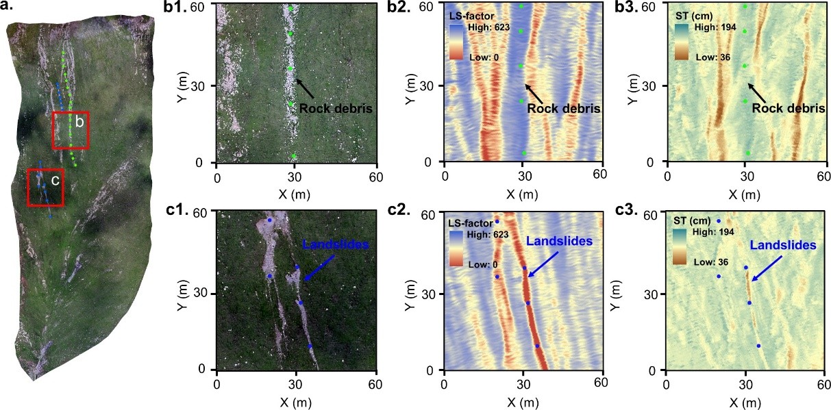 青藏高原素有“地球第三极”之称,其高山草甸土壤在高寒环境下既脆弱又至关重要,不仅影响区域降雨-径流响应,还直接关系到生态系统的稳定性。然而,由于地势险峻、气候苛刻,野外采样困难重重,导致土壤厚度空间分布规律长期以来研究不足。本研究以拉萨市北郊夺底沟子流域为研究区域,针对海拔约5000米的高山草甸土壤开展了系统调查(见图1)。研究团队采集了大量土壤样品,测定了土壤厚度、质地、饱和导水率、有机质含量及矿物组成等关键参数。研究表明,冻融循环和有机质累积是塑造青藏高原高山草甸土壤的主导因素。冻融过程通过抑制有机质分解促进其累积,同时引发岩石崩解和高海拔砾石带的形成;而较低海拔的滑坡则为土壤厚度分布引入更多变数(见图2)。这些机制共同作用,深刻影响了土壤的空间格局,展现了高寒环境下的独特土壤发育规律。