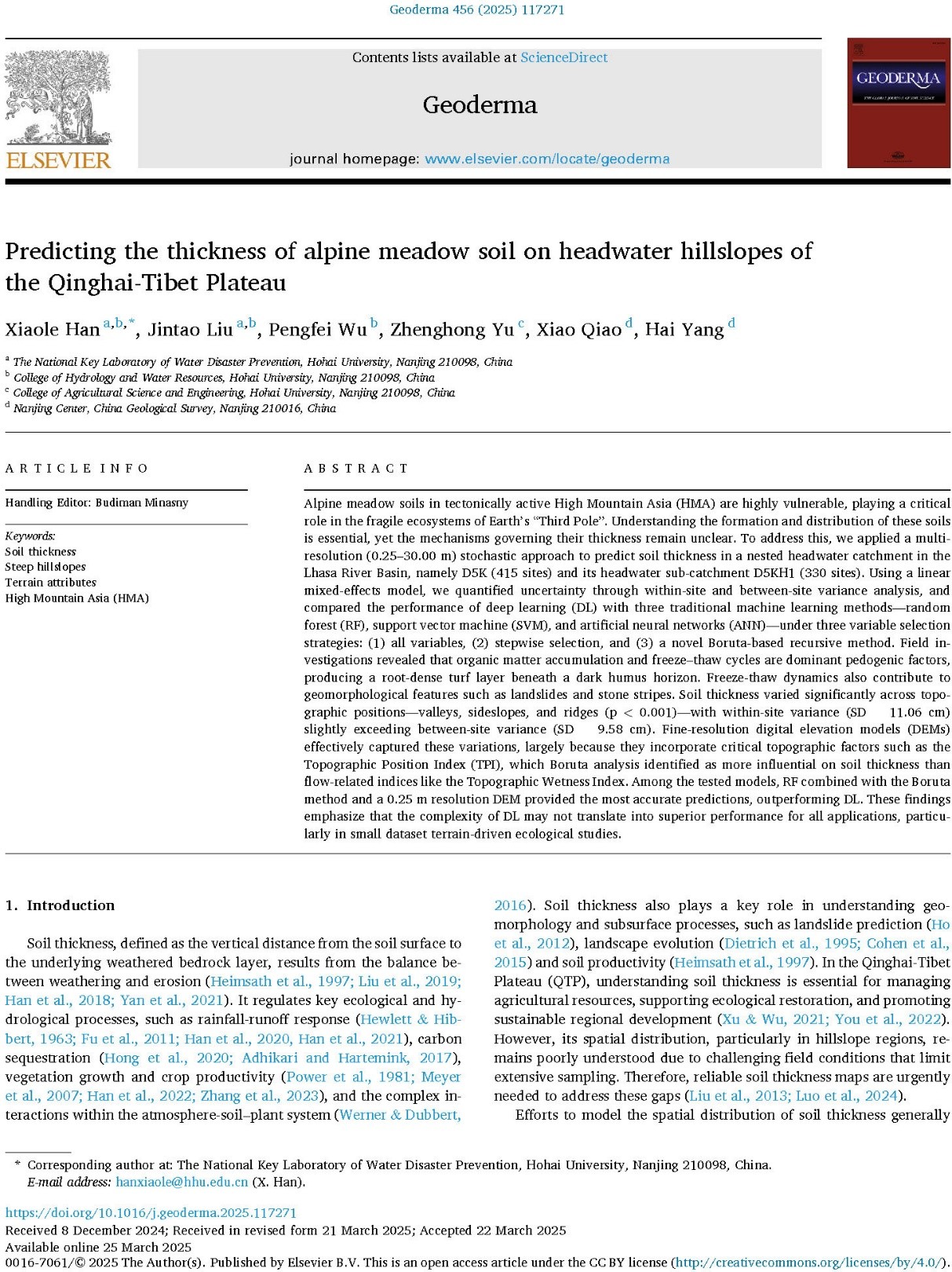 论文信息:Han, X. L., Liu, J. T., Wu P. F., Yu, Z. H., Qiao, X., Yang, H., (2025). Predicting the Thickness of Alpine Meadow Soil on Headwater Hillslopes of the Qinghai-Tibet Plateau. Geoderma, 456, 117271.