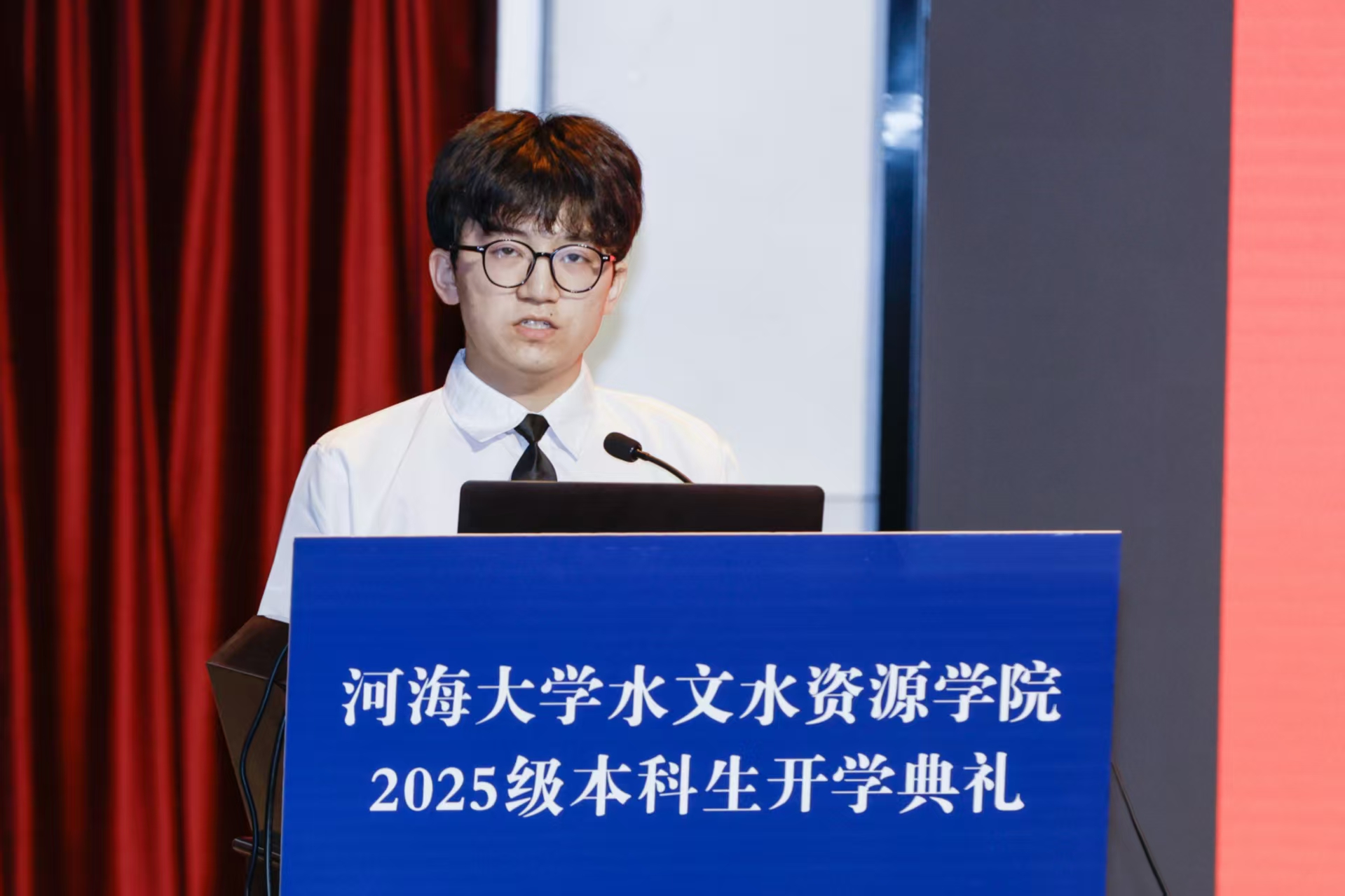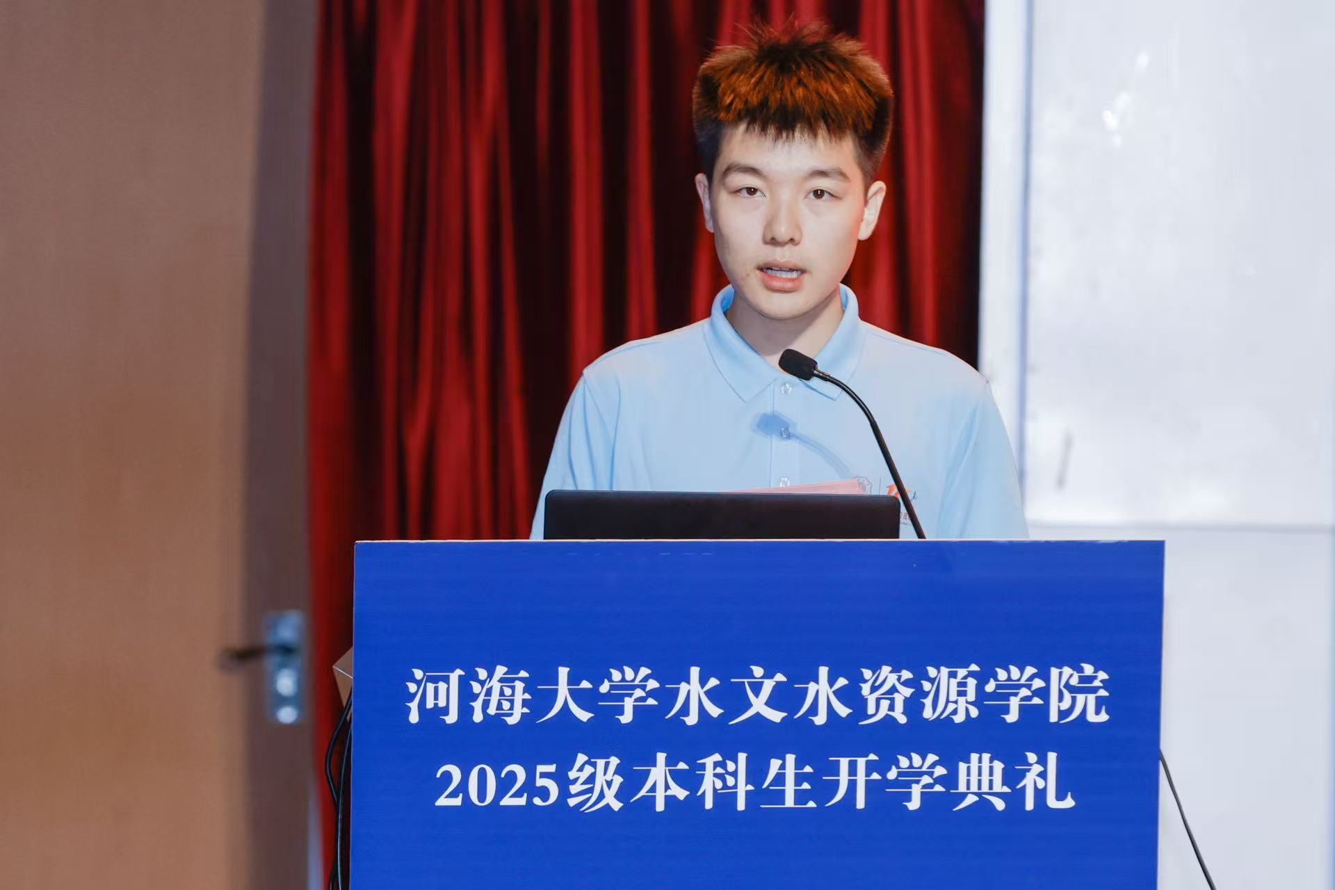 新生代表、2025级国产精品 与水资源工程专业金光耀同学表达了对大学生活的憧憬与决心。他表示将秉承“艰苦朴素、实事求是、严格要求、勇于探索”的河海校训,以师长为榜样,努力成为有理想、敢担当、能吃苦、肯奋斗的新时代青年。