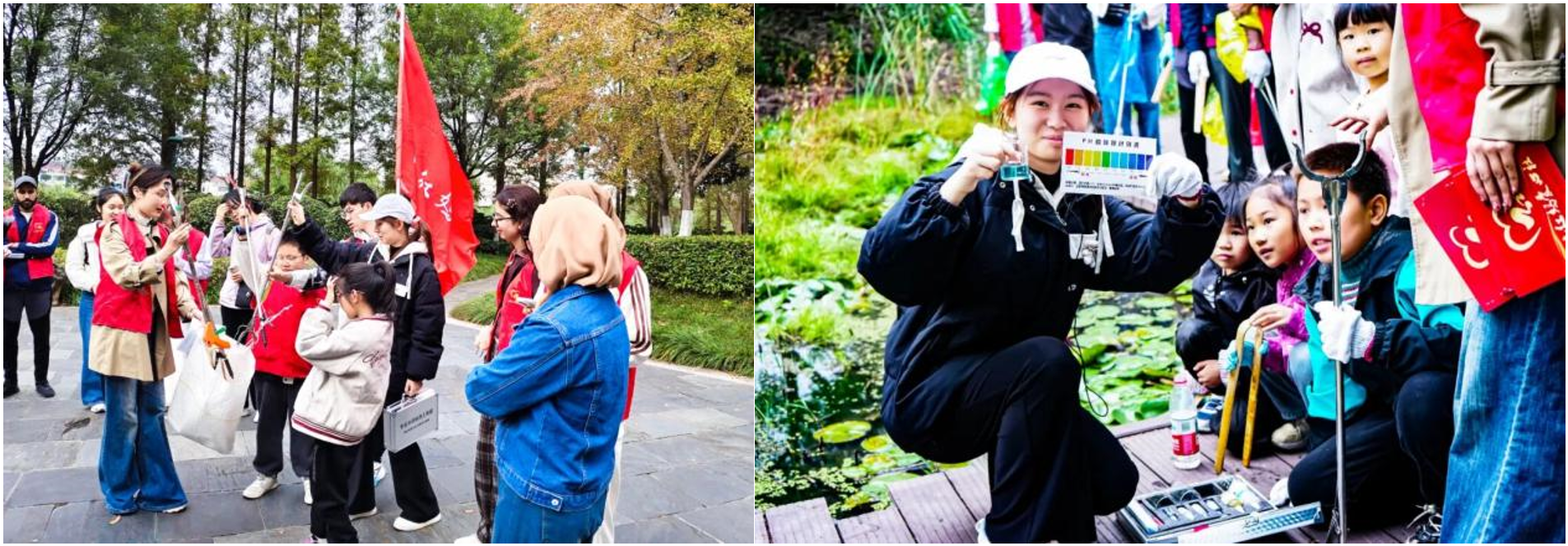 活动尾声,护河队伍在景观亭开展成果分享会。“我们组清理了3公斤垃圾,光塑料瓶就有10多个!”“我们测了3个点位的水质,pH 值都在7左右,河水特别清澈!”孩子们与志愿者们争相举起记录册分享成果,语气里满是自豪。随后,大家共同宣读护河倡议:“不丢垃圾入河,不摘水岸花草,节约每一滴水,守护下塘碧水!”朗朗倡议声吸引了周边市民驻足,家住附近的市民李成彬感慨道:“现在下塘河景色美了,还有大学生带着孩子一起护河,我们更得好好爱护这条河才行。”