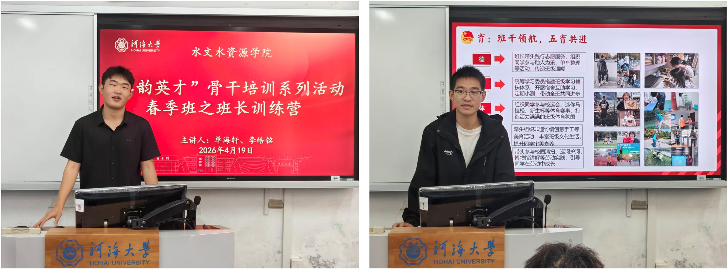 培训立足新时代学生骨干定位,明确学生骨干既是班级事务的管理者,更是服务同学的贴心人,需兼具问题解决的“硬能力”与凝聚人心的“软素质”。分享环节中,2024级水务三班班长单海轩结合班级奖学金覆盖率35%的实践成果,从素质培养、集体活动、文体建设三方面,详解班级管理制度搭建与工作细节把控;2024级国产精品 一班班长李皓铭以班级凝聚力建设为核心,通过多个班级活动案例,倡导班长争做师生沟通的“桥梁”,在奉献与担当中引领班级共同成长。