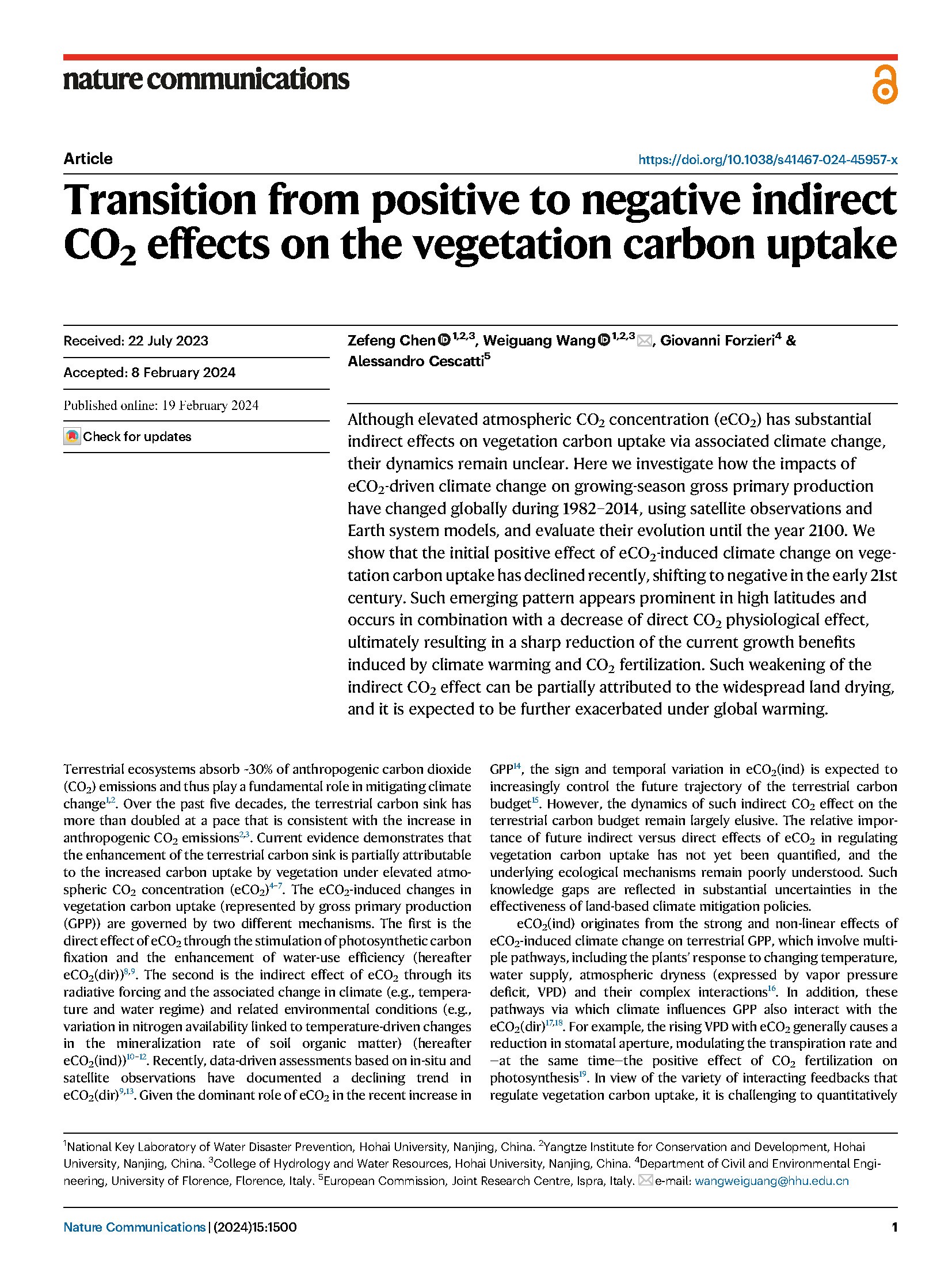 论文信息:Zefeng Chen, Weiguang Wang*, Giovanni Forzieri, & Alessandro Cescatti (2024). Transition from positive to negative indirect CO2 effects on the vegetation carbon uptake. Nature Communications, //www.nature.com/articles/s41467-024-45957-x.